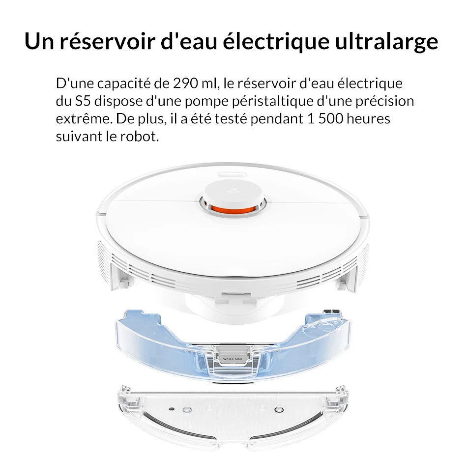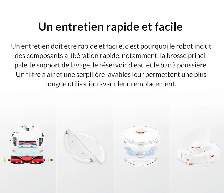 1 x Robot de balayage, 1 x Dock de charge, 1 x adaptateur d'alimentation, 1 x support de vadrouille, 1 x vadrouille, 1 x tampon étanche,1 x muilti-landuage manuel (anglais, français, allemand, italien, espagnol)