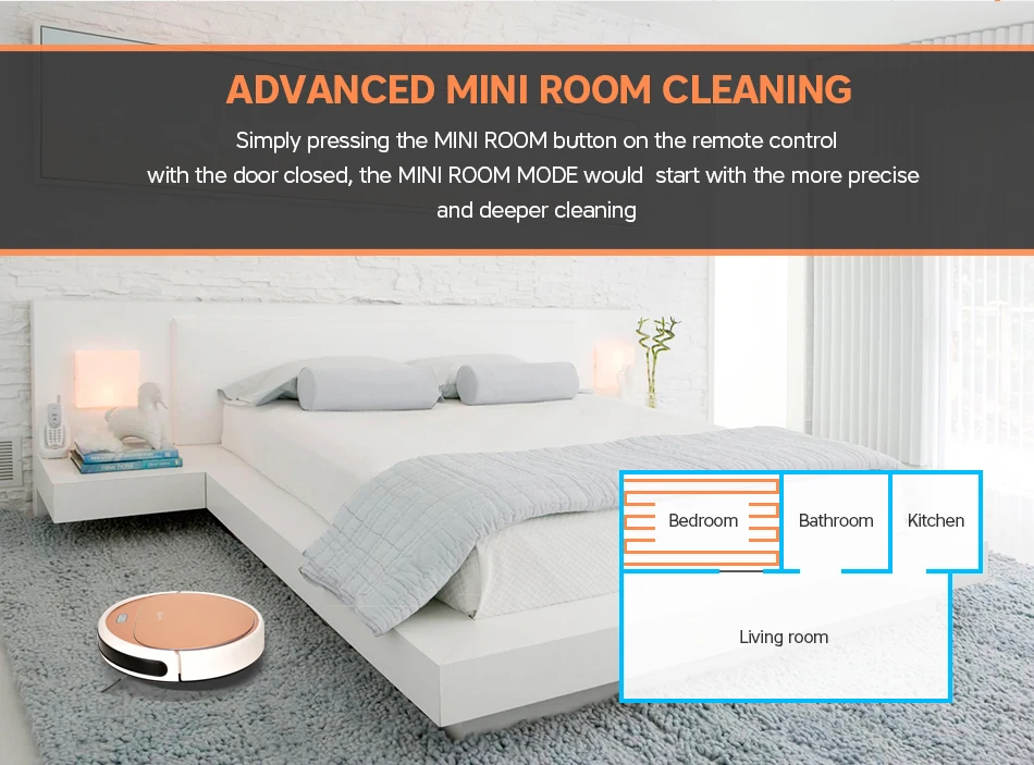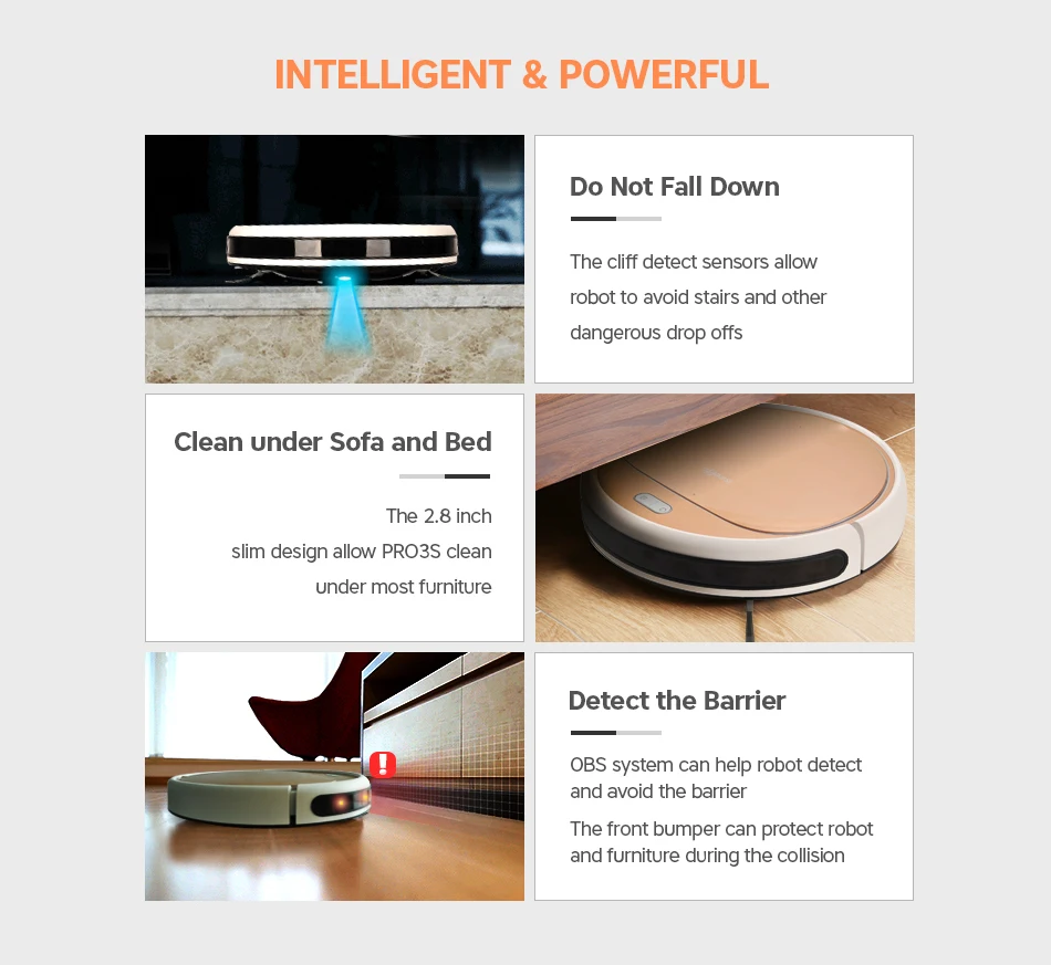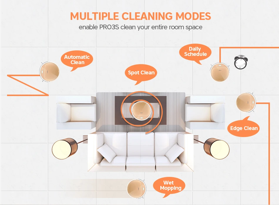 -Horaire quotidienPermet au robot de nettoyer la pièce tous les jours même si vous n'êtes pas à la maison. -Moteur sans balaisFournir une puissance plus forte et une durée de vie plus longue -Bouton de nettoyage et de Charge automatiqueAvec voyant lumineux sur le robot pour une utilisation facile et un statut clair