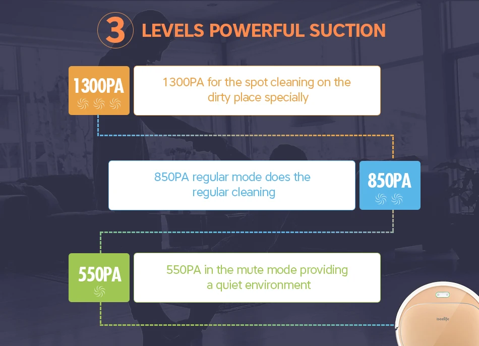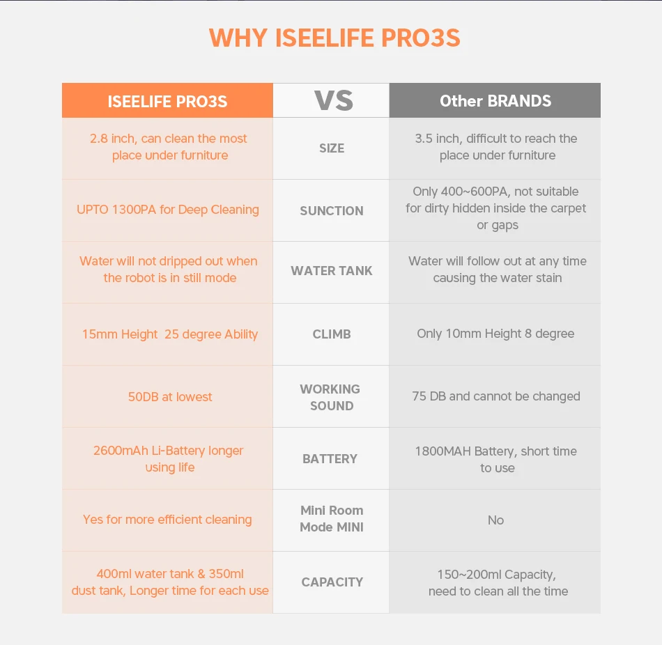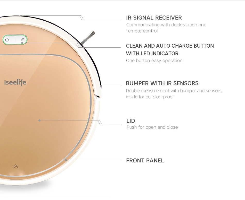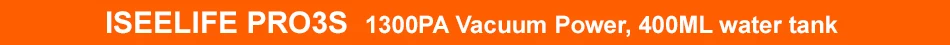 Merci d'avoir choisi ISEELIFE 1300 PA Robot aspirateur Intelligent 2in1 pour la maison réservoir d'eau sèche et humide moteur sans balais ROBOT de nettoyage Intelligent ASPIRADOR -Un Robot, deux fonctions:Aspirateur à sec et nettoyage humide, se déplace automatiquement avec différents réservoirs à l'intérieur -Différence avec les autres robots: 1.L'eau dans le réservoir d'eauEmpêche l'écoulementLorsque le robot cesse de fonctionner (mode veille/veille). 2.Capacité d'escalade amélioréePour 15mm de hauteur ou 25 degrés slop, mieux que l'autre robot 3.Options de Mode muetActiver avec un son de travail inférieur, offrant un environnement beaucoup plus silencieux. 4.Jusqu'à 1300 PAAspirateur pour un nettoyage en profondeur. 5.350 mlGrand réservoir à poussière et400 mlGrand réservoir d'eau -Procédure de nettoyage en 3 étapes: Balayage + aspirateur + serpillière -Système de capteur OBSActiver le robot pour détecter/éviter la barrière et ne pas tomber(Mini. La hauteur détectée est de 10 cm). -LePare-chocs avant avec TPU soupleIl protège le robot et les meubles en cas de collision