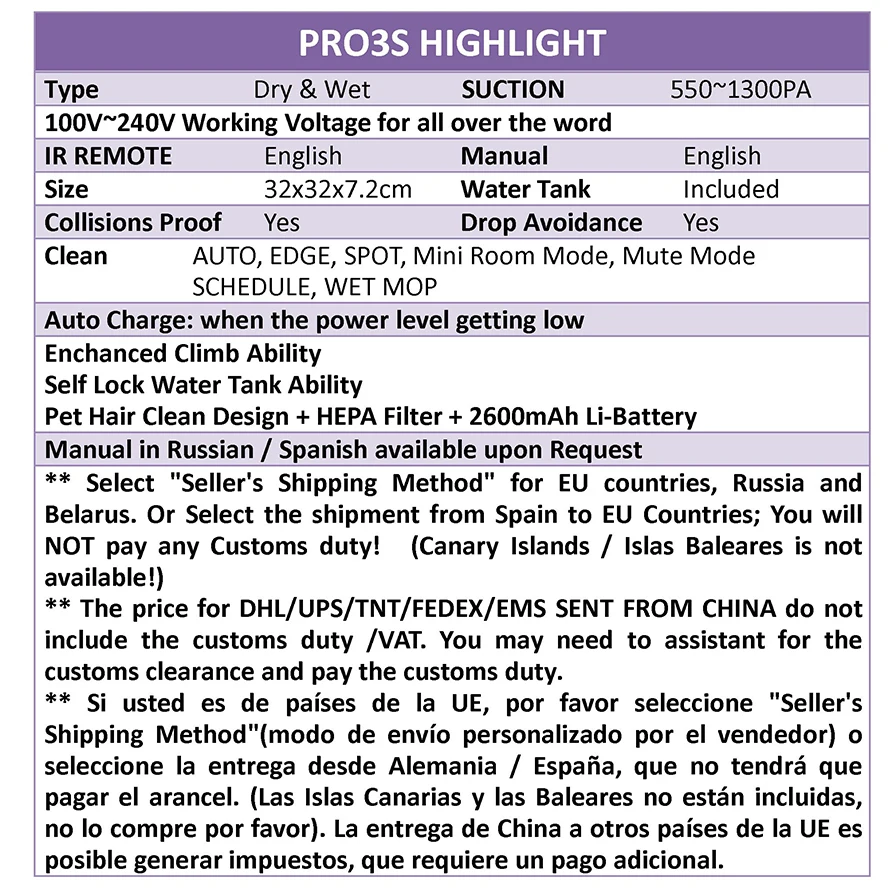 ** En raison de la différence entre le moniteur et l'affichage et l'environnement lumineux, la couleur que vous voyez peut différer de la couleur réelle. ** En raison des différents lots de production, l'impression sur le produit peut différer. *** Le réservoir d'eau/nettoyage humide ne peut pas être fait sur le tapis/le réservoir d'eau et le réservoir de poussière ne peuvent pas être dans le robot en même temps. **** Îles canaries: le Service n'est pas disponible, veuillez ne pas passer la commande.